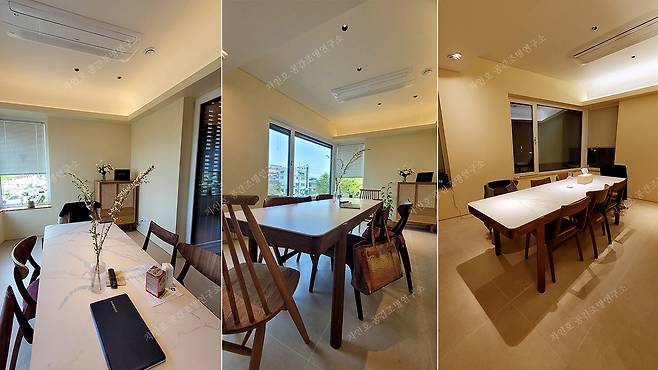 자연광 유입 조건이 좋아 오후 늦게까지 햇빛이 잘 들어올 때는 공간 구석에 상대적으로 짙어지는 음영을 부드럽게 조절하기 위해 낮에도 켜두고 확산광 느낌의 유백색 커버 재질의 쉐이드를 활용하는 것이 좋다.
