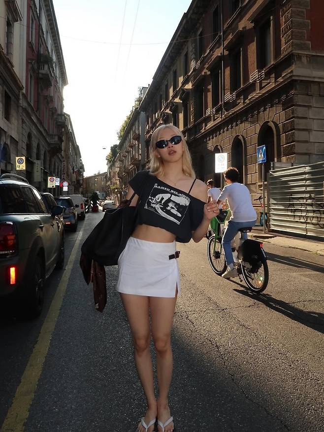 첫 번째 사진 속 로제는 블랙 크롭티에 화이트 팬츠를 매치한 힙한 스트릿 룩을 선보였다.