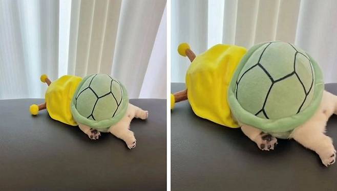 세상 진지하게 '거북이 코스프레 중'인 강아지 한 마리의 사진.