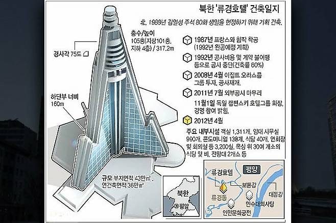 한편 북한에서도 우리의 63빌딩을 보고 그보다 더 높은 건물을 짓고자 계획을 세웠는데 막대한 포부를 안고 시작했던 ‘100층 호텔 건설’은 끝맺음을 하지 못하고 도시의 애물단지로 전락했다.