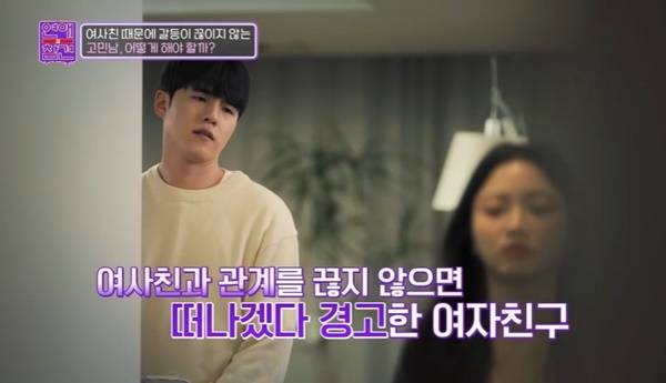 여자친구는 여사친을 대놓고 불편해하기 시작했고, 그런 와중에 고민남은 여사친 포함 친구들 모임을 집에서 갖고 만취해 토한 여사친의 옷까지 갈아입히고 재운 모습으로 여자친구의 분노를 키웠다.