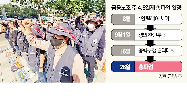 금융노조는 오는 9월 1일부터 쟁의행위 찬반 투표를 시작으로 16일 총력 결의대회를 열고, 26일에는 총파업에 들어간다는 계획이다.