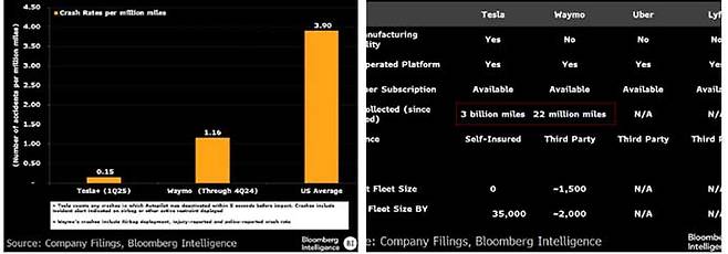 블룸버그 보고서는 또한 테슬라가 출시 이후 30억 마일의 데이터를 수집했다고 주장하며, 웨이모의 2,200만 마일과 비교했다. 그러나 테슬라의 데이터에는 운전자 감독이 필요한 FSD 주행 거리가 포함되어 있으며, 웨이모의 2,200만 마일은 샌프란시스코 내 라이더 전용 마일리지에 불과하다는 점이 지적되고 있다. 실제로 웨이모는 모든 시장을 합쳐 현재 7,100만 마일 이상의 라이더 전용 주행 기록을 보유하고 있다.