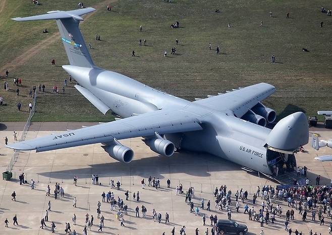 C‑5M Super Galaxy는 미 공군이 운용 중인 전략 수송기 중 가장 거대한 기체다. 길이 75m, 날개폭 68m, 높이 19.8m로, 건물 세 채를 나란히 놓은 크기와 비슷하다. 최대 이륙 중량은 무려 381톤으로, 수송기 중에서도 세계 최고 수준이다. 이름 그대로 ‘은하계급’ 규모를 자랑하는 이 항공기는 미국의 전략 기동력을 상징하는 대표적인 수단이다.