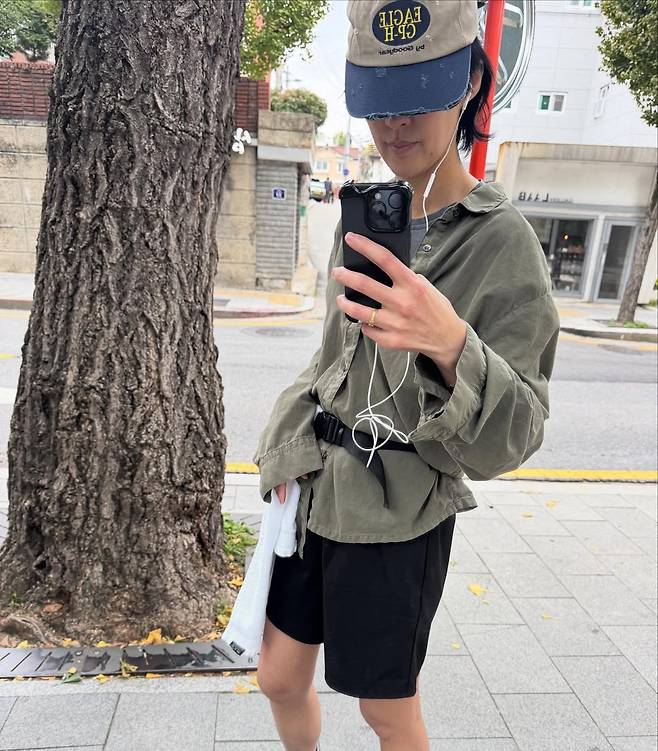 공개된 사진 속 그녀는 카키색 아노락과 파란색 맨투맨 등 편안한 복장이다. 그녀는 여기에 검은색 쇼츠와 빈티지한 볼캡을 매치해 스타일을 완성하고 있었다.