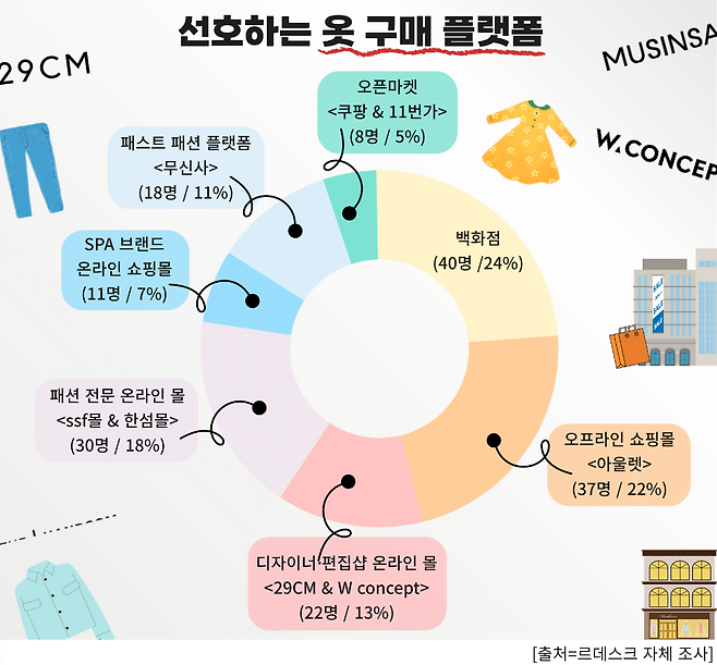르데스크가 강남과 여의도 지역 직장인 170명을 대상으로 실시한 설문조사에 따르면 응답자의 25.9%가 백화점에서 옷을 주로 구매한다고 답했다. 이는 온라인 쇼핑의 편리함과 다양한 브랜드 선택지에도 불구하고 여전히 오프라인 채널에 대한 수요가 크다는 점을 보여준다. 뒤이어 아울렛(21.8%), EQL·한섬몰 등 패션 전문 온라인몰(17.6%)이 주요 구매 경로로 꼽혔다.