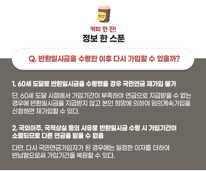 이와 같이 현재 국민연금 가입자는 사망하거나 해외로 이주하는 경우가 아니면 60세가 되기 전에 납부한 보험료를 찾아 쓰기가 어렵습니다.
