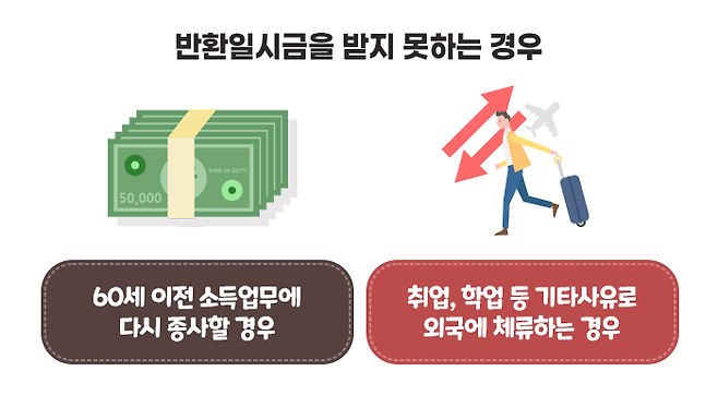 하지만 국민연금 자격을 상실한 자라고 하더라도 60세 도달 전에 소득이 있는 업무에 종사하게 되면 다시 가입자가 되므로 반환일시금을 즉시 지급받을 수 없습니다. 또한 국외이주의 목적이 아닌 취업, 학업 등 기타사유로 외국에 체류하는 경우에도 기간과 상관없이 반환일시금을 지급받을 수 없습니다.
