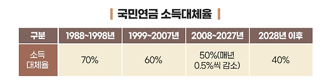 국민연금을 처음 도입하던 1988년부터 1998년까지는 소득대체율을 70% 적용했습니다. 하지만 1999년에는 소득대체율을 60%로 낮췄고, 2008년에는 다시 50%로 떨어뜨렸습니다.