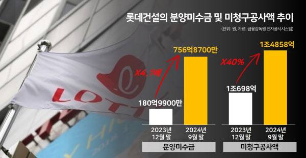 하지만 시공만 담당한 현장이더라도 미분양 기간이 길어지는 경우 분양대금 확보에 따른 공사비 회수에 차질을 빚을 수 있기 때문에 롯데건설 입장에선 여전히 걸림돌일 수 밖에 없다. 실제로 금융감독원 전자공시시스템에 따르면 롯데건설의 분양미수금은 2023년 한 해동안 180억9900만원에서 올해(1월 1일~9월30일) 756억8700만원으로 4배 이상 증가했다. 같은 기간 주택 부문 미청구공사액은 1조698억원에서 1조4858억원으로 40% 정도 늘어난 것으로 공시됐다.