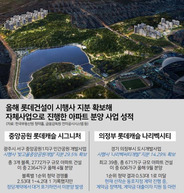 대표적인 현장이 광주시 서구에서 중앙공원1지구 민간공원 개발사업으로 건설하는 ‘중앙공원 롯데캐슬 시그니처’다. 이 사업은 광주시 서구 금호동·화정동·풍암동 일대 243만 5027㎡ 부지에 지하 3층~지상 28층, 39개동, 총 2772가구 규모 대단지를 짓는 프로젝트로 총 사업비만 2조원대에 달한다. 롯데건설은 ‘중앙공원 롯데캐슬 시그니처’ 시행사인 빛고을중앙공원개발(빛고을SPC)의 지분 29.5%를 확보하고 분양 사업에 참여, 시공까지 진행했다.