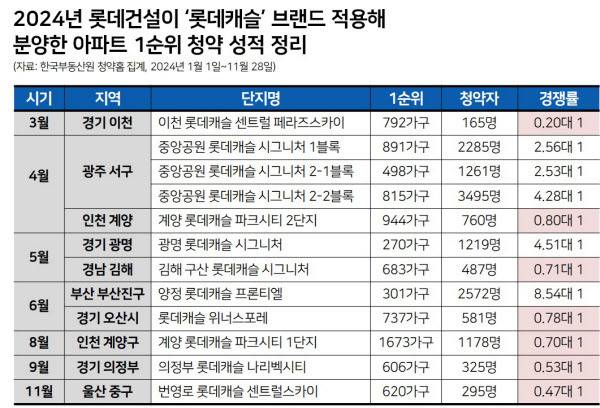 한국부동산원 청약홈에 따르면 올해 들어 롯데건설이 롯데캐슬 브랜드를 적용해 분양에 나선 아파트는 총 12곳이다. 이 중 1순위 청약에서 모집 가구수를 채우지 못해 평균 청약 경쟁률이 1대1에도 미치지 못했던 단지가 7곳으로 전체의 60%에 달한다.