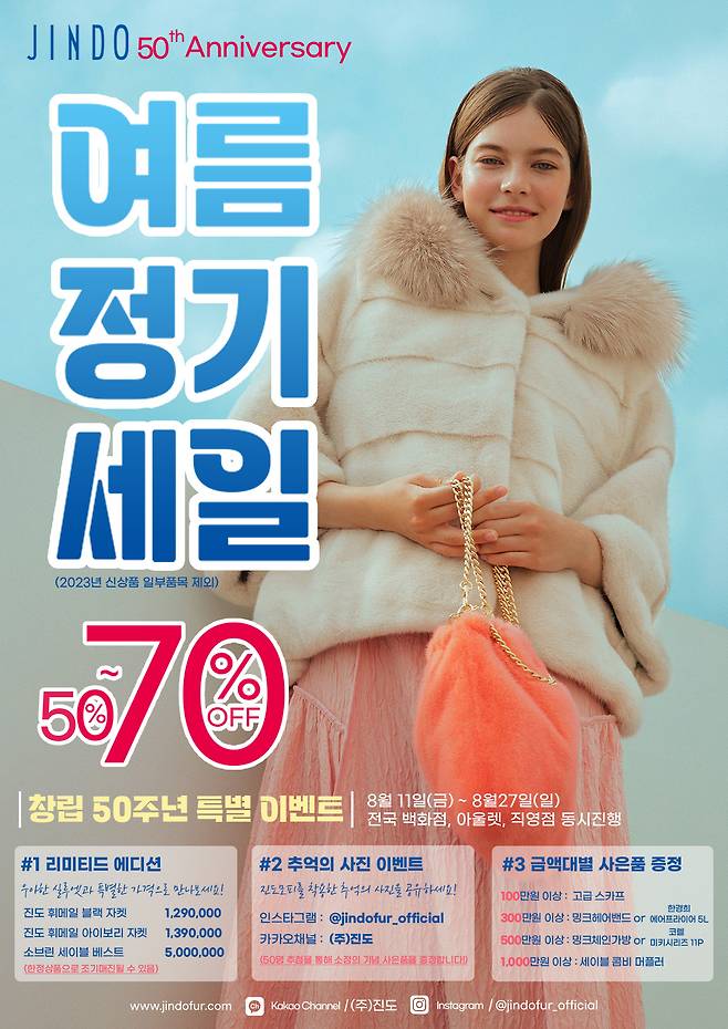 진도모피가 창립 50주년을 기념하여 8월 11일(금)부터 8월 27일(일)까지 전국 주요 백화점 및 아울렛, 직영점에서 여름 정기 세일을 실시한다. 진도 에센셜 컬렉션과 리미티드 에디션을 만나볼 수 있으며, 금액대별 사은품 증정, 추억의 사진 공모 등 풍성한 이벤트까지 마련되어있다.