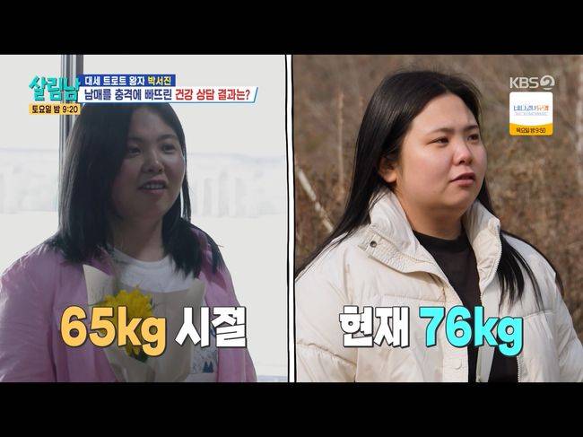 지난 5년간 최고 최저 몸무게를 묻는 말에 박효정은 “최고 체중은 85kg, 최저는 65kg이다”라고 말했다. 이요원은 “그 정도만 빼도 건강해 보인다”라며 걱정했다. 이날 몸무게를 잰 박효정은 “아침에 쟀을 때는 분명 74kg이었는데. 옷 입고 쟀다”라며 불만을 터뜨렸다. 그의 체중은 76kg으로 공개됐다./osen_jin0310@osen.co.kr