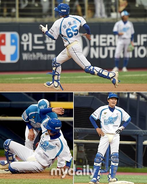 [낭심보호대를 유니폼 밖에 착용하고 자선경기에 나선 정철원. 사진 = 유진형 기자 zolong@mydaily.co.kr]