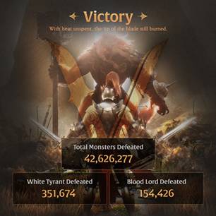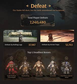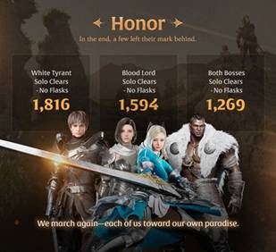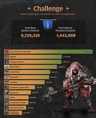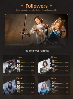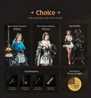 또, 캐릭터 델리아가 가장 높은 인기를 기록한 가운데, 방어 기반 전투에 강점을 지닌 피오나가 동료인 펠로우로 가장 많은 선택을 받았다. 플레이어를 가장 많이 처치한 보스는 놀 치프틴 카마인거스트로 파악됐으며, 특수 의뢰 콘텐츠로 만나 볼 수 있었던 보스 몬스터 블러드로드는 총 15만 4426회 처치됐다.