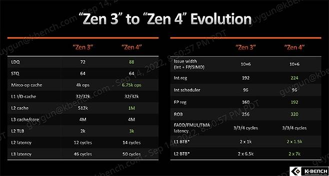 그래서 Zen3와 Zen4의 구조적인 특징들을 비교하면 레지스터나 버퍼 같은 임시저장소 크기가 확장된 것이 눈에 띄는데 L2 캐쉬가 512K에서 1M로 확장된 것 또한 같은 의미라 이해하면 된다. 실제, 계산 단계에서는 Zen3와 다를 바 없어 AMD도 13%의 IPC 개선 중 익스큐션 엔진이 차지하는 비중은 가장 작은 것으로 표현하고 있다.