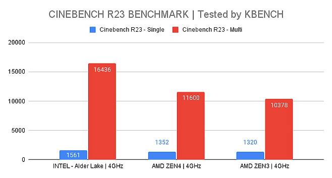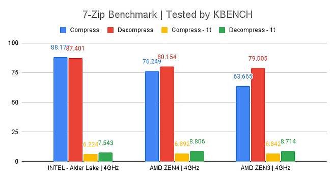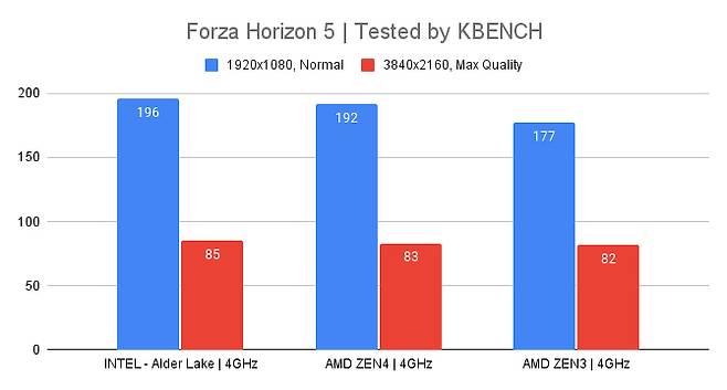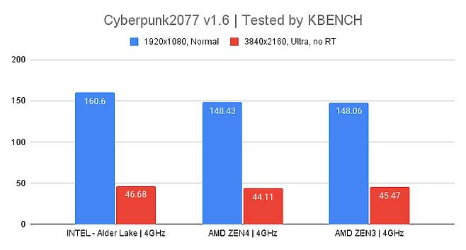 테스트에 사용한 클럭은 AMD와 인텔 모두 4GHz 고정이며 인텔의 i5-12600KF는 P코어와 E코어로 구분된 구조여서 선택적인 테스트가 가능한 조건에서만 개별 테스트를 진행했다.