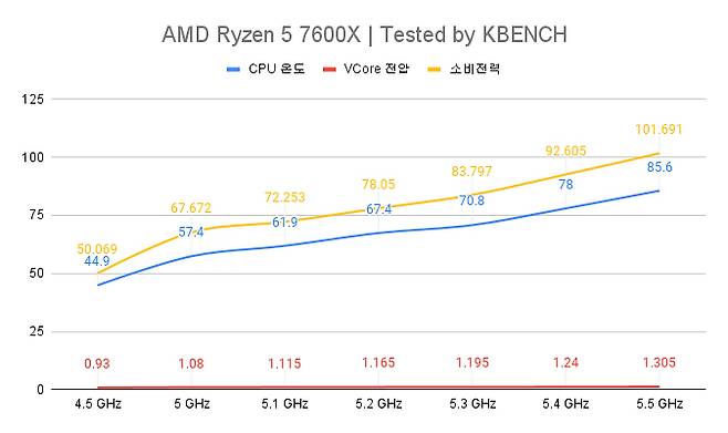 참고로, 위 차트는 ZEN4와 라이젠 7000 시리즈의 고클럭 전략이 가져오는 온도와 소비전력 문제를 보여주기 위해 테스트한 것으로, 만약 라이젠 7000 시리즈가 예전 처럼 최대 클럭을 5GHz 이하로 제한했다면 과거의 저전력, 저발열 프로세서라는 명성을 그대로 이어갈 수 있었다는 것을 보여주고 있다.