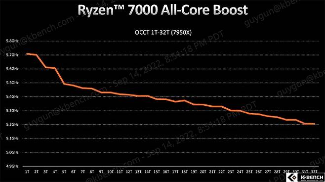 다만, 클럭이 5GHz를 넘어서면서 그로 인한 소비전력 증가와 발열은 AMD에게도 부담이 될 수 밖에 없는데 어차피 인텔은 AMD 보다 조건이 더 열악하니 그런 부분을 비교해도 크게 문제될 것은 없다는 입장인 것 같다. 결국 성능을 위해 소비전력과 발열을 희생한 것이 라이젠 7000 시리즈의 현실이고 이제는 AIO 수냉 쿨러를 준비해야 할 만큼 AMD도 뜨거운 CPU라는 점 알아두기 바란다.
