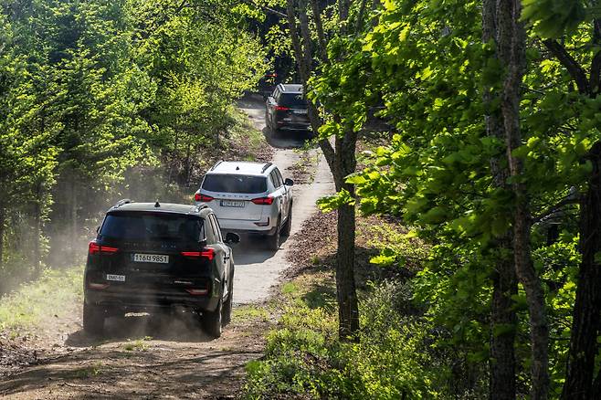 숙소인 화천 평화의 댐 캠핑장에 도착. 짐을 풀자마자 인스트럭터가 우리를 인근 오프로드 코스로 안내했다. 이번 행사를 위해 KG 모빌리티가 양구군에 출입 허가를 받아낸 길로, 자동차 한 대만 지나갈 수 있는 편도 약 20분 거리의 좁은 임도다. 사륜구동과 LD(Locking Differential) 시스템이 들어간 시승차들은 성큼성큼 언덕을 오르기 시작했다. 한쪽 바퀴가 번쩍 들릴 정도의 험로는 아니었기에, 로(Low) 기어를 물리지 않고도 금세 정상에 다다랐다.