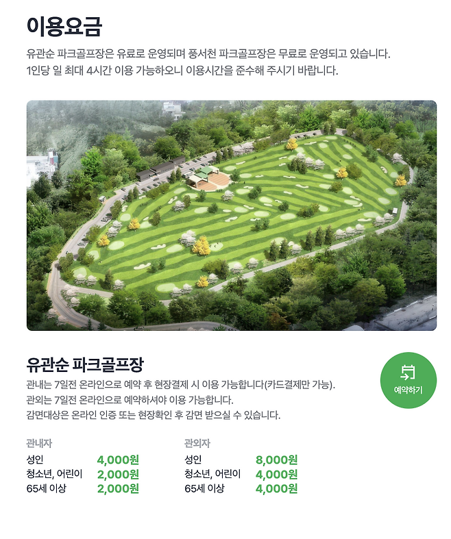 유관순파크골프장은 100% 온라인 예약제로 운영되고 있습니다. 현장 방문 시에는 예약 없이 이용이 불가능하므로, 사전에 반드시 예약해야 합니다.