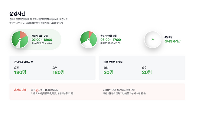 운영시간은 계절에 따라 달라집니다. 하절기(5-9월)에는 오전 7시부터 오후 6시까지, 동절기(10-3월)에는 오전 8시부터 오후 5시까지 운영됩니다.
