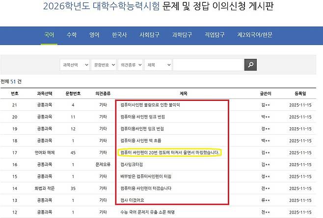 17일 오후 5시 50분 현재, 한국교육과정평가원 누리집 <2026학년도 대학수학능력시험 문제 및 정답 이의신청 게시판>에는 제공된 답안지 표기용 컴퓨터용 사인펜 품질 불량으로 물리적·정신적 피해를 봤다는 불만과 하소연이 100여 건 올라왔다.