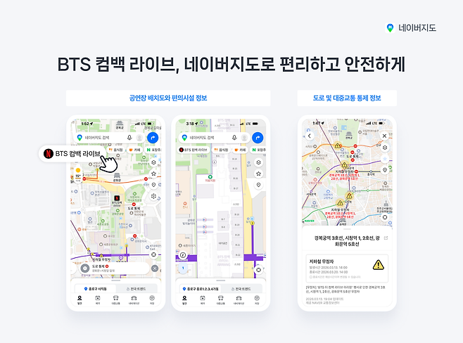 21일 업계에 따르면 네이버지도는 이날 오후 8시 광화문에서 진행 예정인 ‘BTS 컴백 라이브 : 아리랑’ 공연의 좌석 정보와 주변 편의시설을 확인할 수 있는 공연장 지도를 넷플릭스와 협조해 제공한다. 공연장을 찾는 사용자들이 화장실부터 게이트, 의료시설 등 주요 편의시설 정보를 다국어 서비스로 제공할 예정이다. 또 이동 시 참고할 수 있도록 공연장 인근 도로 통제 구간과 대중교통 무정차 및 우회 구간 등의 정보도 실시간으로 확인할 수 있도록 했다. 아울러 네이버지도 상에서 방탄소년단 관련 버블 키워드를 클릭하면, 광화문 일대의 거리뷰 3D를 확인할 수 있다.