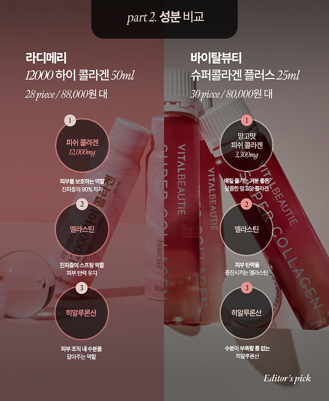 에디터가 오늘 전격 비교할 제품은 요즘 가장 핫한 액상 저분자 콜라겐, '라디메리 12000 하이 콜라겐'과 '바이탈뷰티 슈퍼콜라겐 플러스'다.