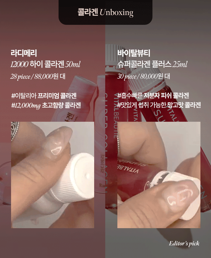 두 제품 모두 피부에 필요한 콜라겐을 공급해 주는 중요한 역할을 하지만, 그 특성과 성분에서 차이가 있기 때문에 에디터의 리뷰를 보고 원하는 제품을 고르는 데 도움이 되길 바란다.