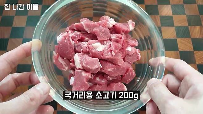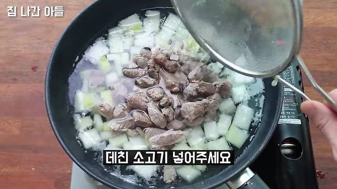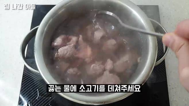 소고기는 국거리용으로 준비해 주세요. 양지, 사태소고기를 끓는 물에 살짝 데쳐주세요. 핏물과 불순물 제거를 위한 과정이에요., 앞다리살이 잘 어울립니다.