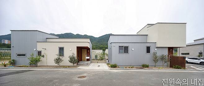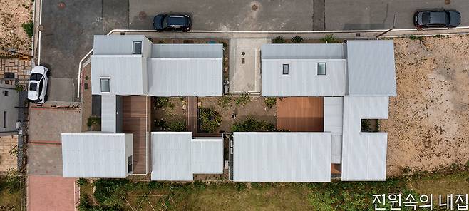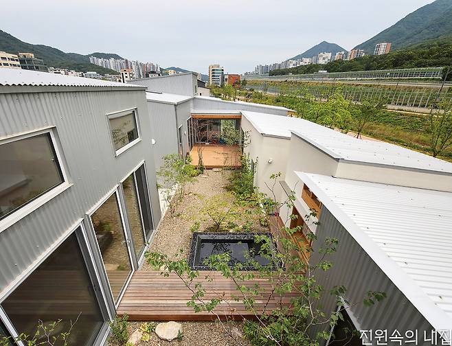 “이 집의 정원은 두 가족이 각각의 일상에서 우연히 조우하고 소통하는 매개체가 됩니다.” ‘스튜디오 인플럭스’ 이우진 대표는 분리된 두 필지의 연결성을 높이기 위해 정원을 주요한 장치로 두었다. 우선 두 집 모두 남측의 공용 산책길로부터 프라이버시를 지키는 동시에 멀리 금정산의 풍경을 담을 수 있도록 침실 공간을 남측에 배면으로 배치하고, 공용 공간은 고저 차를 주어 북측에 높게 배치했다. 이렇게 ‘ㄷ’자로 놓인 집의 중앙에 정원을 조성함으로써 남측과 북측 어디에서든 자연을 감상할 수 있도록 계획했다. 건축가는 두 집의 중정을 하나로 연결하여 함께 공유하는 형태를 제안했고, 건축주는 이에 흔쾌히 동의했다.