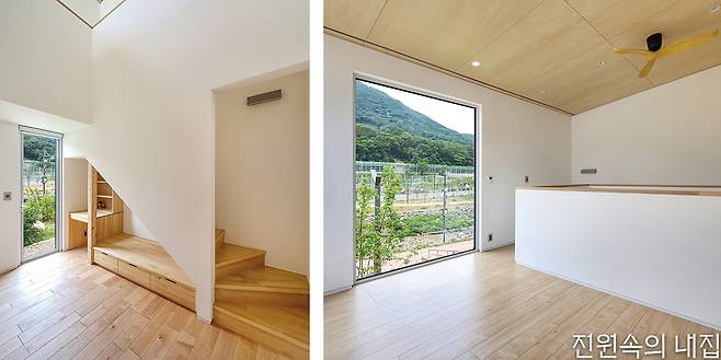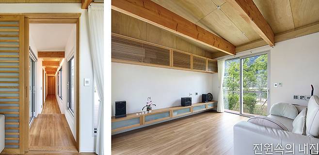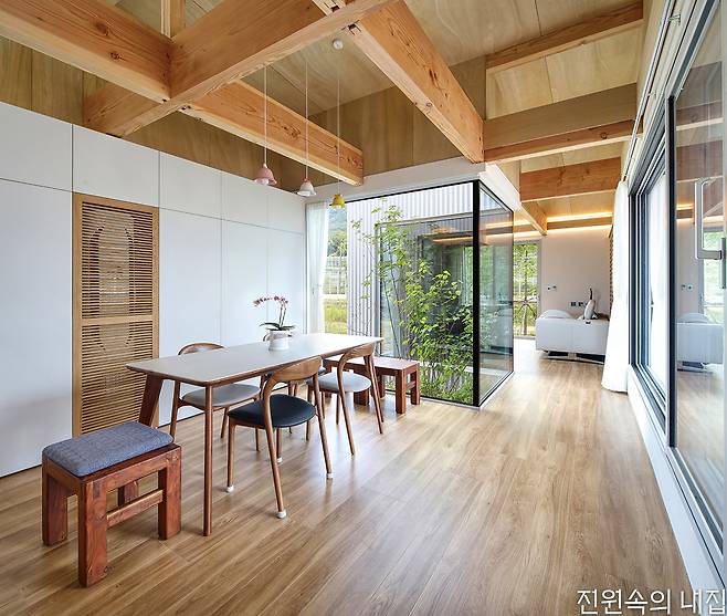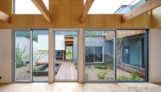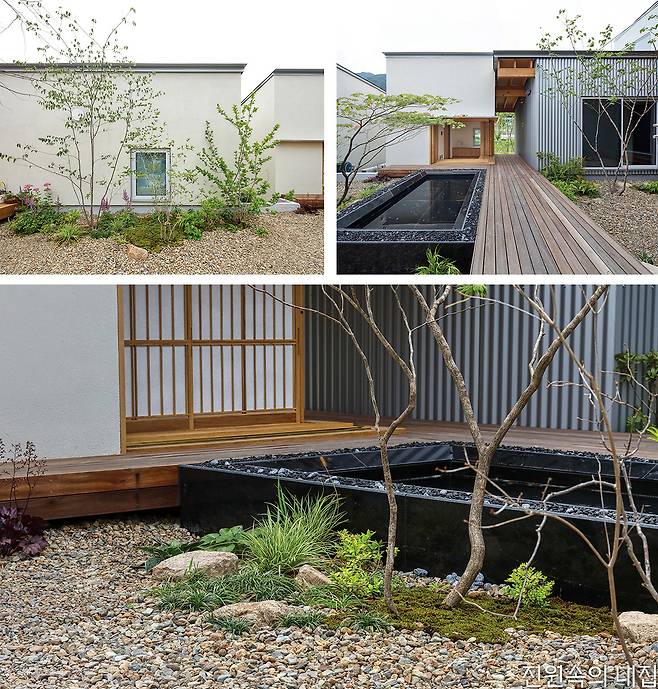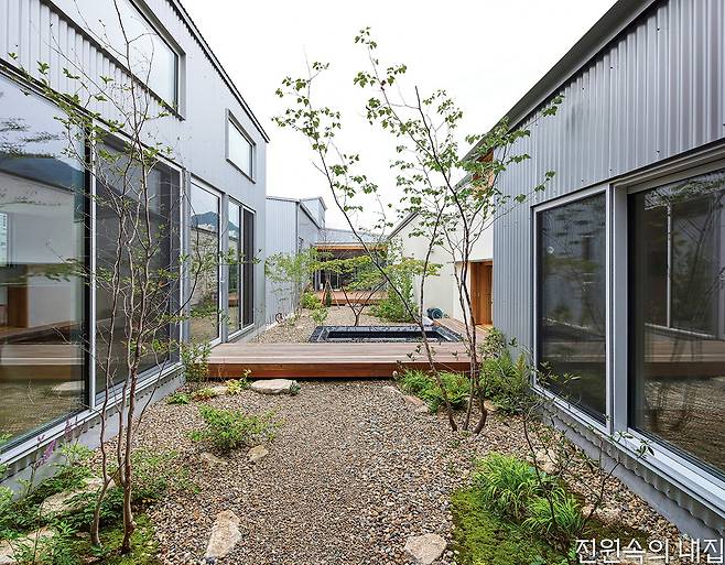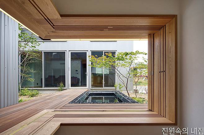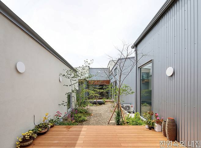 60대인 다른 건축주 부부는 아파트 생활에서 벗어나 자연과 가까운 주택에서 노후를 보내고자 했다. 처음에는 막연한 생각이었지만, 옆 필지의 든든한 동료를 만나 과감하게 집 짓기를 시작해 볼 수 있었다고 전했다. 생활의 편의를 위해 단층으로 구성된 집은 거실 내부에도 중정을 두어 자연과 접점을 한층 높였다. 메인 데크를 넉넉하게 구성해 외부공간 활용도를 강화했고, 침실이 나란히 이어진 남측 복도에서는 정원의 모습이 갤러리처럼 담긴다.