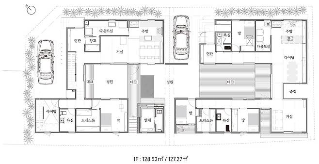 두 집은 서로 닮았지만 두 가족의 라이프스타일에 맞게 디테일을 갖췄다. 40대인 건축주는 어린 시절부터 마당 있는 집에 대한 로망이 있었고, 중학생 때부터 자신만의 주택을 설계하는 등 계속해서 꿈을 키워왔다. 시간이 흘러 가족을 꾸린 건축주는 이제 초등학교 5학년이 된 자녀에게 마당 있는 집에 대한 추억을 선물하고 싶어 오랜 꿈을 실행하게 되었다. 아이를 위해 복층 구조를 그리면서 2층짜리 집이 되었고, 세 가족이 각자 독립된 방을 갖되 외부 환경을 통해 서로 연결될 수 있는 구조를 원했다. 모든 공간에서 정원을 향해 창이 열려 있고 데크와 브리지, 2층 테라스 등을 매개로 가족의 시선과 동선이 연결된다.