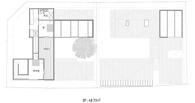 우선 직선과 사각으로 이루어진 주택에 부드러운 선을 가진 나무들을 적절하게 배치했다. 나무 위주의 정원은 저관리 정원의 한 방법으로, 뿌리만 잘 내리면 관리에 어려움이 없다. 산딸나무, 단풍나무, 노각나무, 생강나무 등 선이 곱고 단풍이 아름다운 교목을 중심으로 선택했다. 가는 가지가 정원 내에서 여러 겹 겹치며 공간감을 만들어 내고, 두 집의 프라이버시가 배려된 공간을 만들 수 있었다.