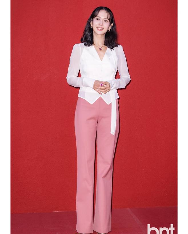 여기에 하이웨이스트 핑크 슬랙스를 매치하면서 전체적으로 페미닌하면서도 세련된 무드를 완성했죠.