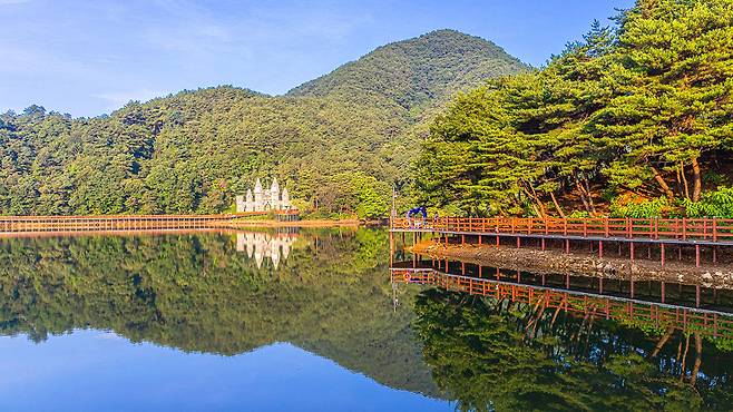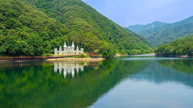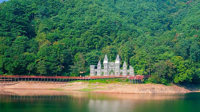 비룡담저수지를 더욱 특별하게 만드는 건 숲 사이로 모습을 드러내는 유럽풍 구조물이다. 정체를 알 수 없는 이 건축물은 마치 수면 위에 세워진 고성(古城)을 연상시킨다.