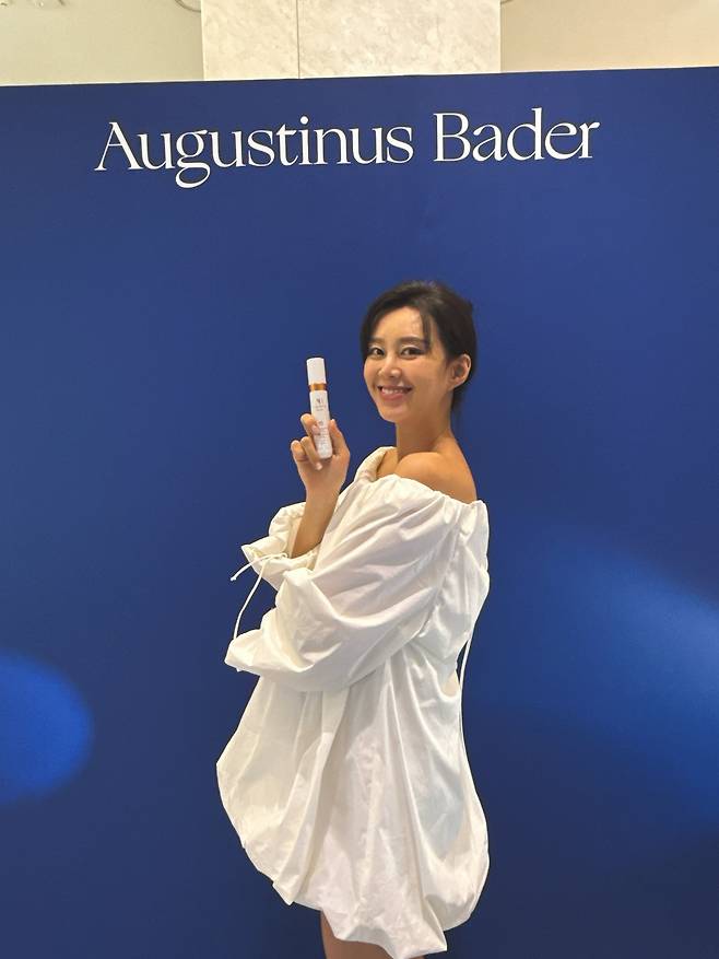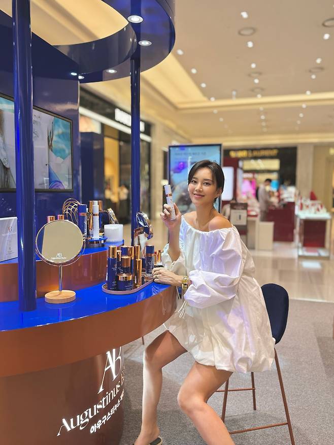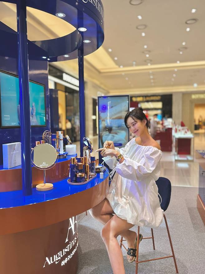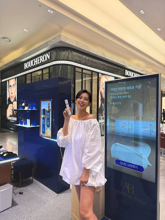 앉아서 제품을 테스트할 때도, 손에 든 선케어 제품을 가볍게 들어 보일 때도, 눈빛은 부드럽고 환했어요.