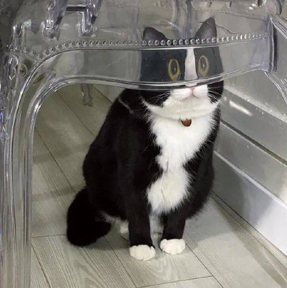 플라스틱 의자 밑에 있는데, 투명 선글라스를 쓴 것처럼 보이네요. 패션의 완성은 위한 위장인 것이죠?