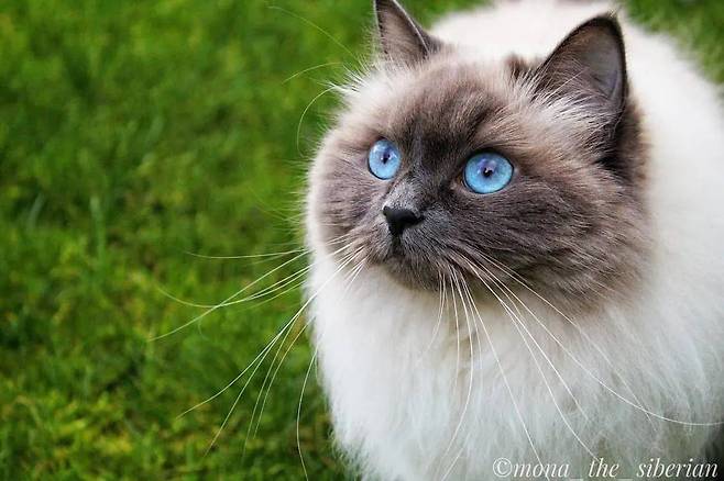 보기만 하세요! 파란 눈, 까만 얼굴 털, 하얀 몸통. 이런 고양이 본 적 있나요?