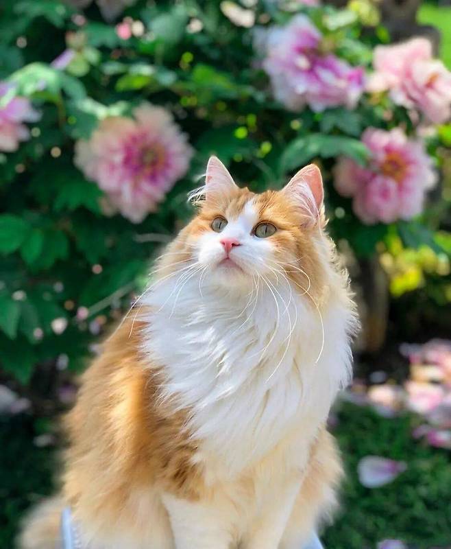 누가 꽃인지 알 수 없을 정도로 아름다운 고양이가 여기에 있습니다.