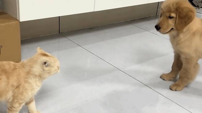 거실 한편에 따스한 오후 햇살이 스며들자, 주인이 돌보는 작은 금빛 강아지와 새로 맡겨진 고양이가 조심스럽게 서로의 냄새를 맡으며 첫 인사를 나눕니다. 처음에는 서로의 존재를 천천히 탐색하는 조심스러운 분위기가 흘렀습니다.