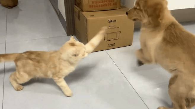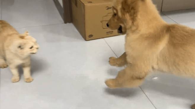 갑자기 강아지가 신나서 껑충껑충 뛰며 놀자는 몸짓을 보입니다. 마치 오랜 친구를 다시 만난 듯한 표정으로 고양이에게 다가가 장난을 유도하고, 그 강렬한 환영 인사는 예상치 못한 반응을 불러일으킵니다.