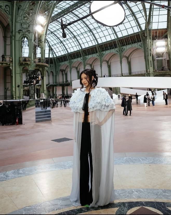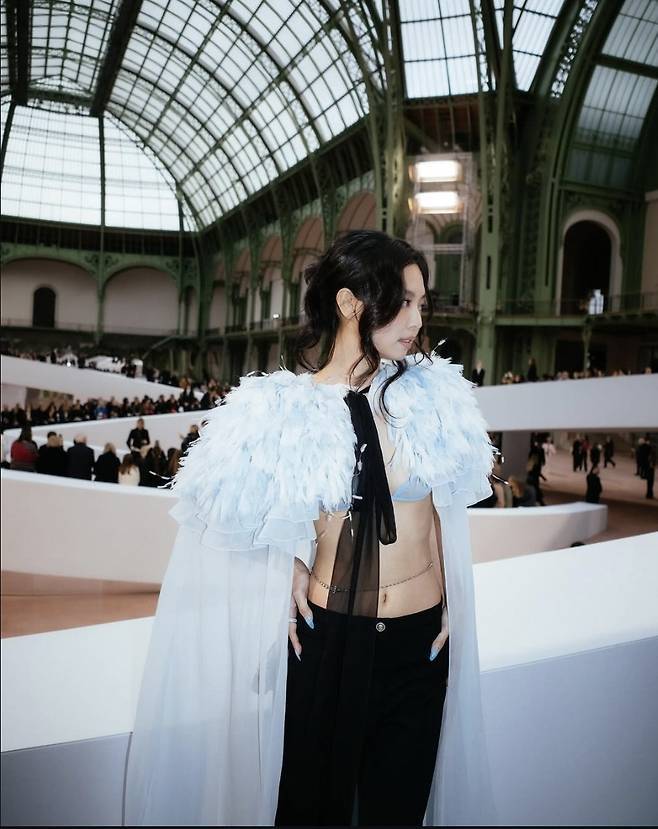 자연스럽게 연출된 웨이브 헤어와 은은한 메이크업이 전체적인 스타일을 더욱 돋보이게 만들었으며, 자신감 넘치는 포즈와 카리스마 넘치는 눈빛이 패션쇼 현장을 압도했습니다.