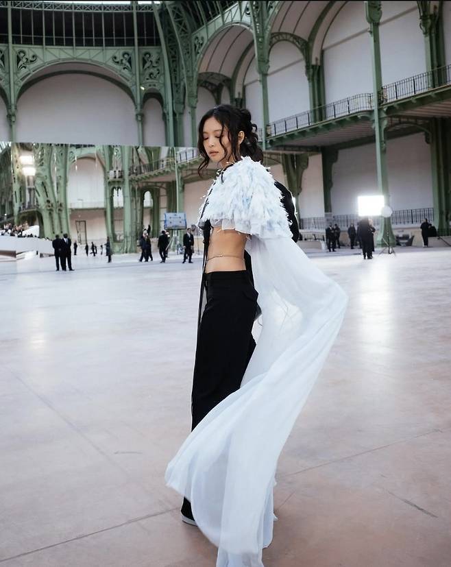 제니는 화려한 화이트 퍼프 숄더 디테일이 돋보이는 란제리 스타일의 크롭 톱과 시스루 케이프를 매치해 우아하면서도 대담한 룩을 완성했습니다.