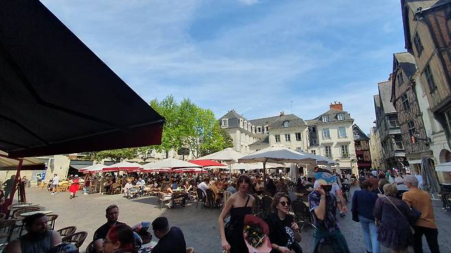 사람들은 갑작스럽게 더워진 날씨에 반팔과 반바지를 입고 야외 테라스에서 커피를 즐겼다. 여름 모습이다.