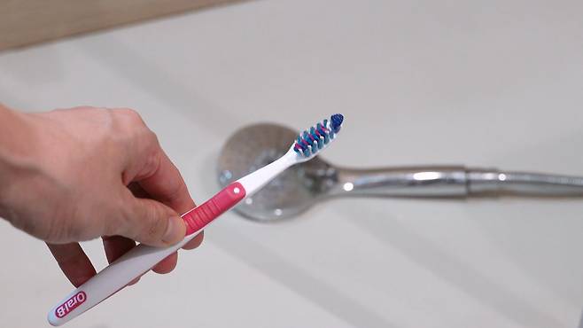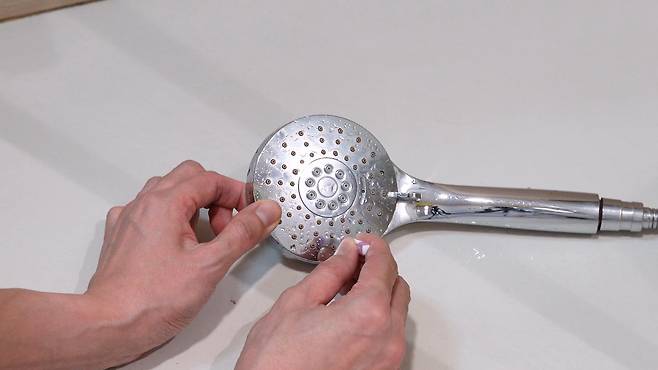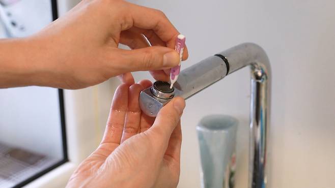 물때를 제대로 제거하려면 다 쓴 치간칫솔을 이용하면 되는데요. 치간 칫솔로 샤워기의 작은 구멍 하나하나 넣어 닦아 주면 끝!
