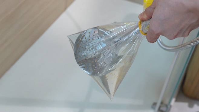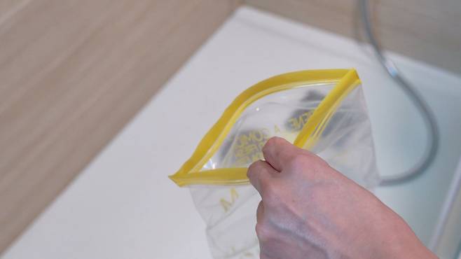 수도꼭지도 마찬가지로 지퍼백을 씌워 수도꼭지 부분이 잠기도록 해주면 돼요.