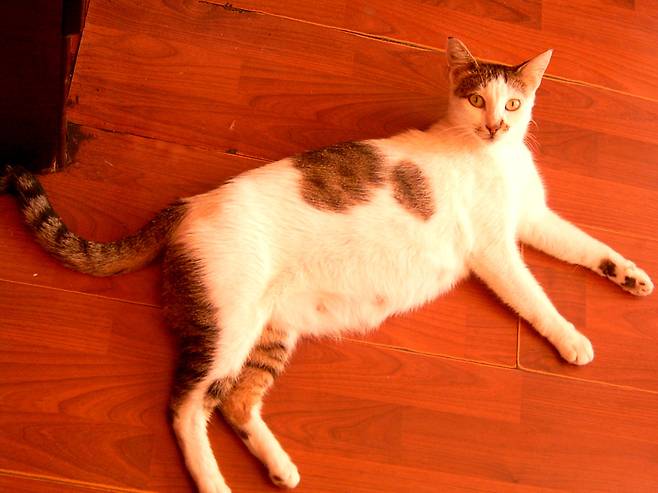 고양이가 임신한 지 5~6주가 되면 눈에 띌 정도로 배가 부풀어요. 그리고 평소보다 밥을 더 많이 먹게 됩니다. 그리고 젖꼭지 주변 털이 빠져 잘 보인다고 합니다.